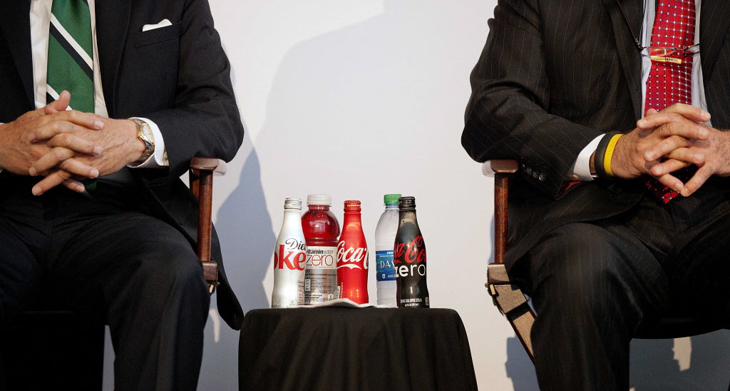 Coca-Cola products sit on a table between CEO Muhtar Kent, right, and Georgia Gov. Nathan Deal, left, at an event where the company announced it will work to make lower-calorie drinks and clear nutrition information more widely available around the world Wednesday in Atlanta. You write the cutline. (AP photo)