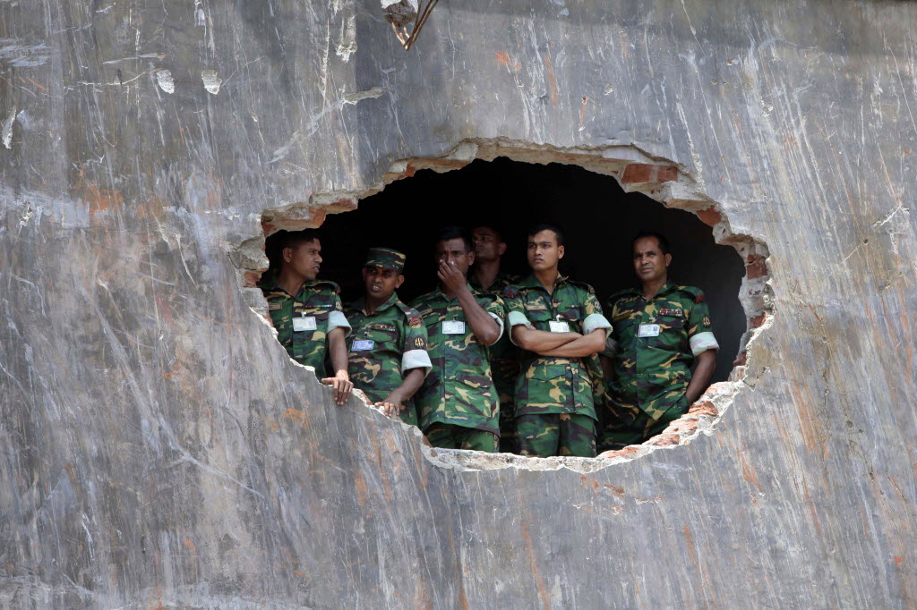 Bangladesh army soldiers watch a prayer ceremony for the souls of the 1,127 people who died in a garment building structure collapse last month, in Savar, near Bangladesh, Tuesday. The Islamic prayer service was held a day after the army ended the nearly three-week, painstaking search for bodies among the rubble of the worst tragedy in the history of the global garment industry and turned control of the site over to the civilian government for cleanup. (AP Photo/A.M. Ahad)