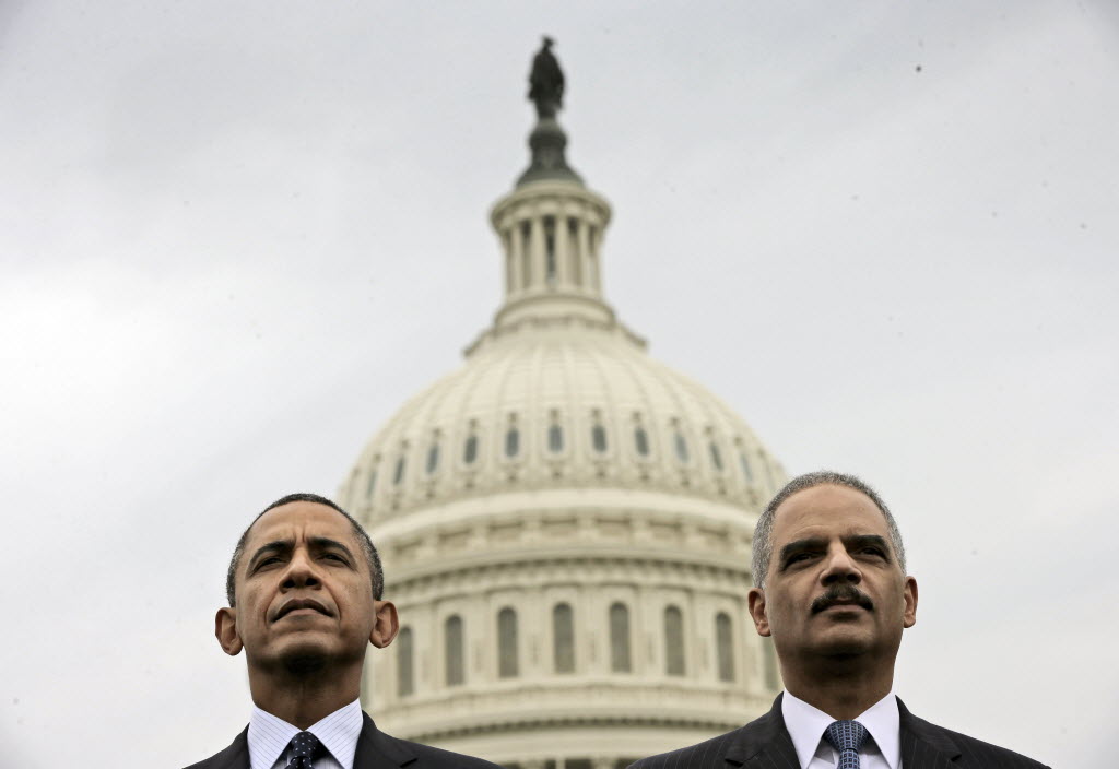 President Barack Obama sits with Attorney General Eric Holder during the 32nd annual the National Peace Officers Memorial Service earlier today on Capitol Hill in Washington, honoring law enforcement officers who died in the line of duty. (AP Photo/Pablo Martinez Monsivais)
