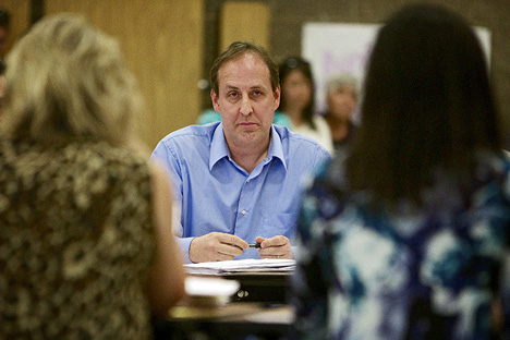 Coeur d’Alene Education Association representative Tim Sandford listens to the Coeur d’Alene School Board trustees present their position on the budget during a negotiations meeting Tuesday at Woodland Middle School. Story here and here . (Coeur d’Alene Press photo: Jerome A. Pollos)