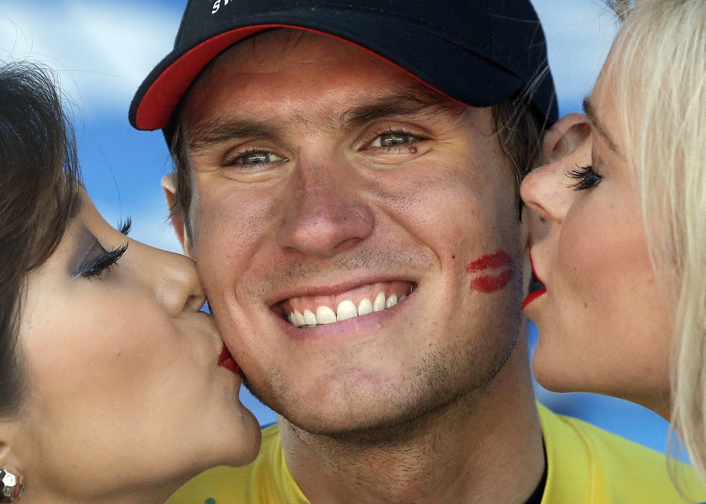 Tejay Van Garderen gets kissed on the podium after winning the Tour of California cycling race in Santa Rosa, Calif., on Sunday. You write the cutline. (AP Photo/Marcio Jose Sanchez)