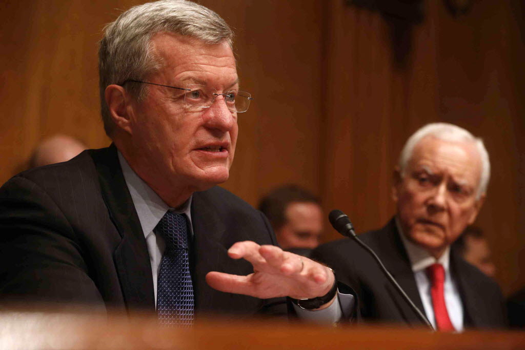 Senate Finance Committee Chairman Sen. Max Baucus, D-Mont. left, accompanied by the committee’s ranking Republican Sen. Orrin Hatch, R-Utah, questions ousted IRS Chief Steve Miller, former IRS Commissioner Douglas Shulman, and J. Russell George, Treasury Inspector General for Tax Administration, on Capitol Hill, in Washington. (AP Photo/Charles Dharapak)
