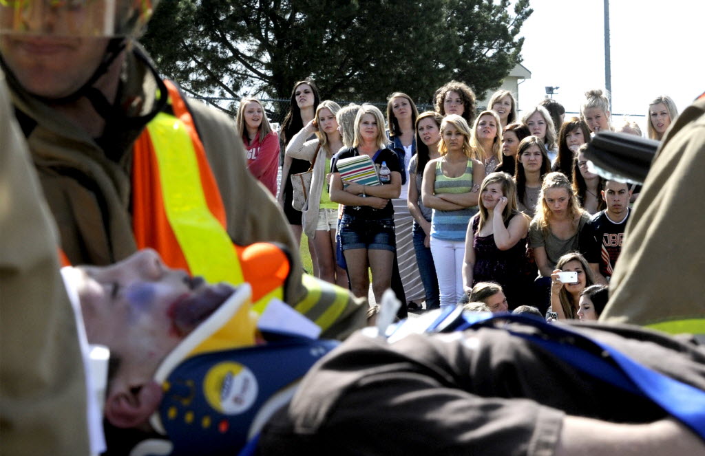 Lake City High School students watch as senior Jacob Wilkinson is transported to an ambulance during a mock DUI accident near the school in Coeur d’Alene, Idaho this morning. Coeur d’Alene Fire and Police worked along with Kootenai County Sheriff’s Department, Idaho State police and Spokane Air 1 to provide graduating seniors a graphic reminder that with celebrations just around the corner not to get behind the wheel drunk. (SR photo: Kathy Plonka)