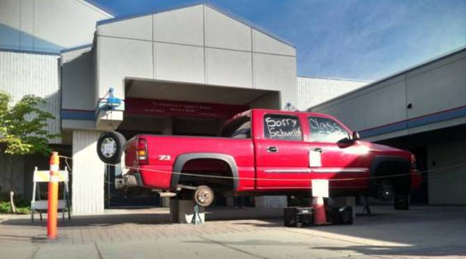 A funny thing happened to Coeur d’Alene High School Vice Principal Troy Schueller this morning. Seems graduating seniors at the high school targeted his pickup for their annual Student Prank. Huckleberries is told that the lugnuts for the pickup tires will be returned to Schueller throughout the day, so he’ll be able to drive home this afternoon.