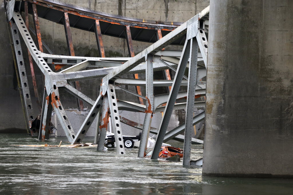 A car, lower right, and what is believed to be a travel trailer lie in the Skagit River with debris from the collapsed portion of the Interstate 5 bridge Friday in Mount Vernon, Wash. A truck carrying an oversize load struck the four-lane bridge on the major thoroughfare between Seattle and Canada, sending a section of the span and two vehicles into the Skagit River below Thursday evening. All three occupants suffered only minor injuries. At an overnight news conference, Washington State Patrol Chief John Batiste blamed the collapse on a tractor-trailer carrying a tall load that hit an upper part of the span. Story here. (AP Photo/Elaine Thompson)