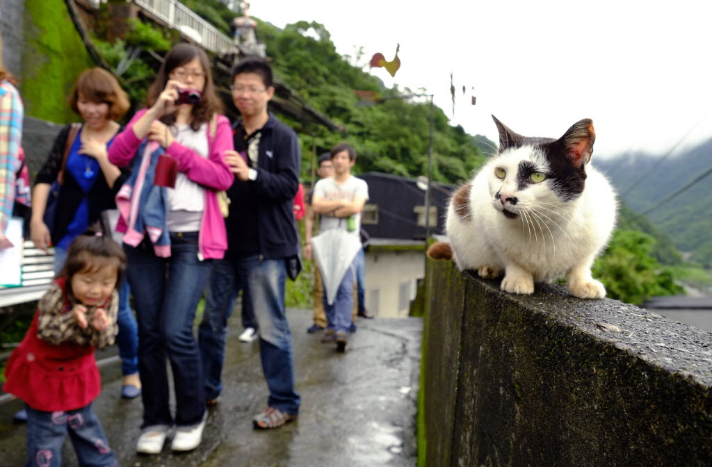 Tourists stop to view one of the hundred or so resident cats resting on a wall in the small town of Houtong, Taiwan. Cat lovers arrive by the dozens to fondle and photograph the felines of Houtong, one of Taiwan’s former coal mining communities. Local residents welcome the unexpected rise in tourism due to the large feline population by building feeding points, lounging pedestals and have gone as far as constructing an elevated bridge for cats and visitors to roam across the passing railroad tracks. You write the cutline. (AP Photo/Wally Santana)