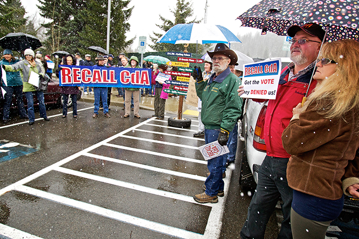 Blast from the Past: In this Coeur d’Alene Press file photo from April 2012, Jeff and Pam Tyler stand under their umbrella as supporters of a recall of Coeur d’Alene’s mayor and half of the city council chant outside of city hall Wednesday. (Press photo: Jerome A. Pollos)