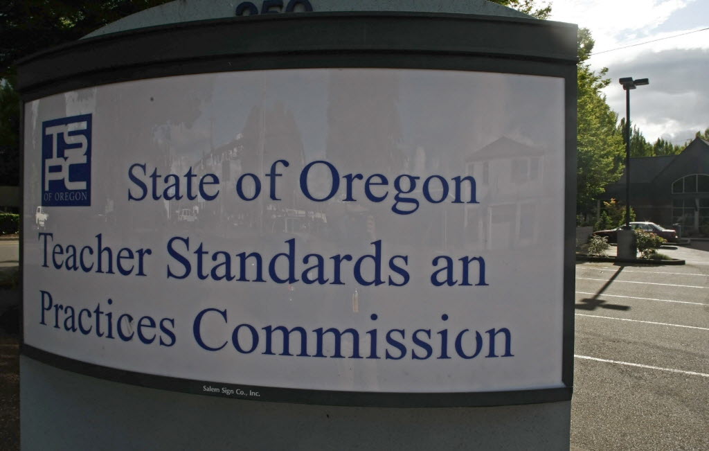 A sign is shown in the parking lot of the state Teacher Standards and Practices Commission in Salem, Ore., on Wednesday. An upset man brought a pressure cooker he claimed was a bomb into the state Teacher Standards and Practices Commission office on Wednesday and informed employees he had tried to blow up their sign because it was misspelled, a state official said. This side of the sign is missing the letter “d” in the word “and.” Story here. (AP Photo/Statesman-Journal: Timothy J. Gonzalez)
