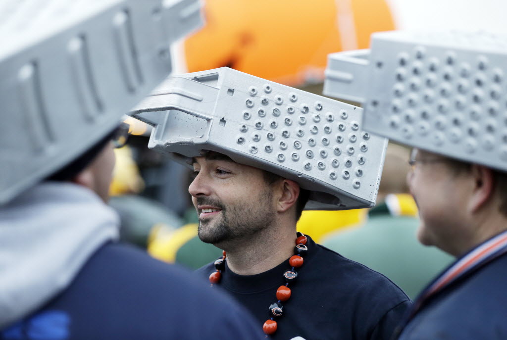 Chicago Bears fan Dean Donlon wears a cheese grater hat before NFL football game against the Green Bay Packers Monday in Green Bay, Wis. The graters were designed by a Boise man. Idaho Statesman story here. (AP Photo/Mike Roemer)