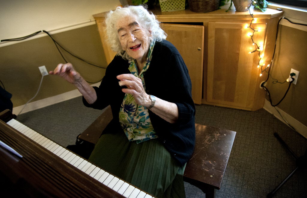 Audrey Willey, 94, strikes the final notes of the classic song “Danny Boy” as she performed piano for a Thanksgiving lunch gathering at the Southside Senior & Community Center on Tuesday in Spokane. Willey has some 200 songs she plays form memory. “I don’t have to carry music around. It’s in my computer” she said as she pointed to her brain. She started playing at the center one year ago and prefers WWII era songs, with the most request being “in The Mood.” (SR photo: Dan Pelle)