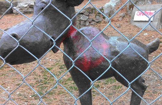 Gabe Cohen/KHQ snapped this photo of the vandalized Mudgy & Millie statue on McEuen Field, at the base of the 3rd Street entrance to Tubbs Hill. You can read his report here.