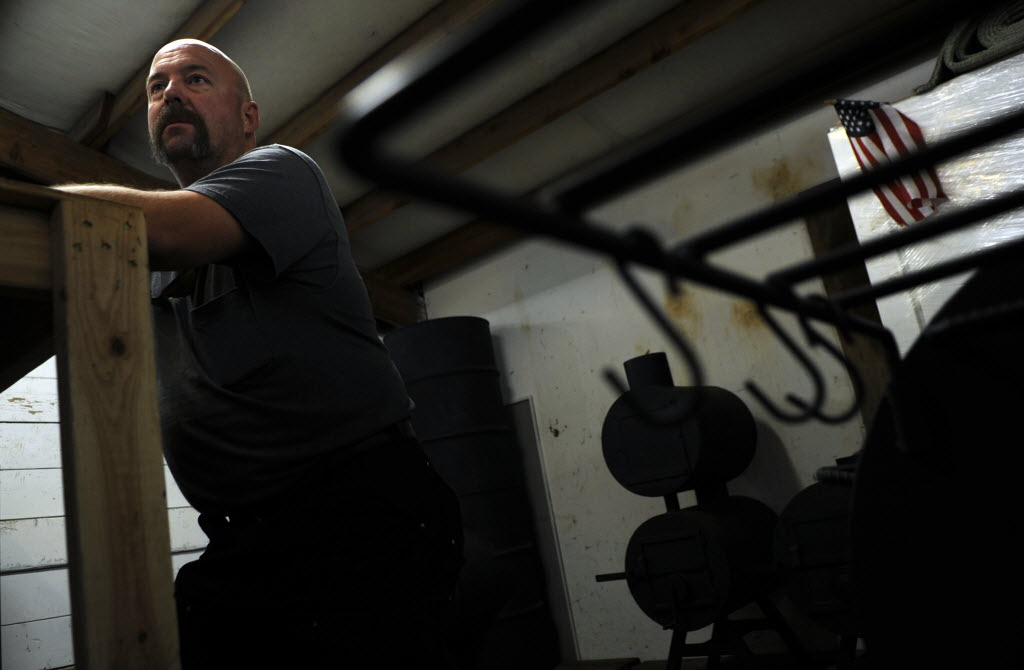“I like making things with my hands,” said Blaine Porter as he talked about the outdoor wood stoves he makes from recycled materials at his home in Rathdrum on Friday. Blaine is a firefighter, this is a side business for him and he markets them to hunters and campers. (SR photo: Kathy Plonka)