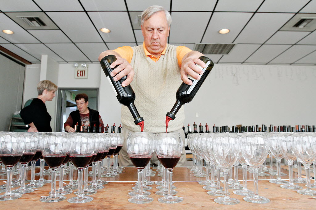 Mike Rader pours the first flight of cabernet sauvignon earlier today as judging began for Wine Press Northwest’s 14th annual Platinum Judging at Clover Island Inn in Kennewick, Wash. More than 600 wines from Washington, Oregon, Idaho and British Columbia are judged over three days. To qualify, a wine has to have won gold in a previous competition. Results will be published in the winter issue of Wine Press Northwest. (AP Photo/Tri-City Herald, Kai-Huei Yau)