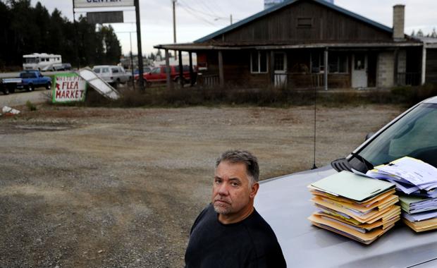 Developer Alan Johnson stands with stacks of documents from a lawsuit against him at the intersection of highways 95 and 54 in Athol. A fight with the Idaho Transportation Department has held up development of a travel center, grocery store and hotel on the site. SR story here. (SR photo: Kathy Plonka)