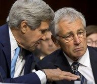 (AP photo: Secretary of State John Kerry, left, and Defense Secretary Chuck Hagel talk prior to Senate Foreign Relations Committee hearing on Syria)
