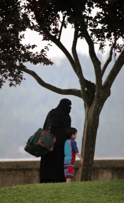 At City Beach during the Labor Day weekend, a visitor guides a young boy along the sidewalk while others enjoy an annual concert by the Coeur d’Alene Symphony at City Park. (Photo: Duane Rasmussen)