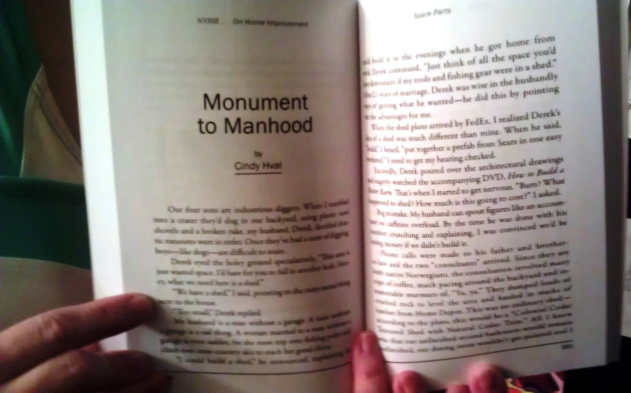 For the 12th time or so, Sidekick Cindy has had a story published in an anthology. This time, her story, “Monument to Manhood,” has landed in the “Not Your Mother’s Book on Home Improvement.” (You can see Cindy thumbing through the book above.)