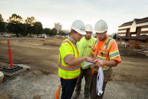 (Gabe Green’s Press photo: President of Welch Comer Engineers and Surveyors, Phil Boyd, left, talks with Travis Forsman, right, and Adam Morris, middle, of Cameron Reilly)