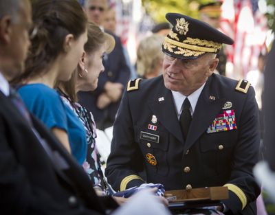 Brig. Gen. Alan Gayhart, retired, presents a U.S. Flag to Brenda Daehling of Dalton, Mass., earlier today during the 4th annual memorial service at the Idaho Fallen Soldier Memorial in Boise. Mrs. Daehling is the mother of Idaho soldier Mitchell Daehling who was killed in Afghanistan in May. Dignitaries, veterans, honor guards, patriots and the families of four soldiers gathered to honor the sacrifice of 66 soldiers in a ceremony that unveiled etchings of the most recent soldiers who gave their lives in service to their country: Mitchell Daehling, Octavio Herrera, Thomas Murach and Shane Wilson. (AP/Statesman photo: Darin Oswald)