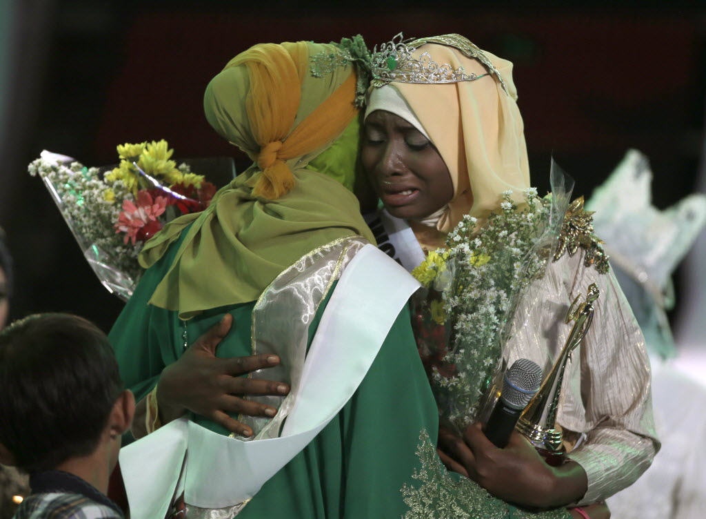 Obabiyi Aishah Ajibola of Nigeria, right, weeps as she is congratulated by her compatriot Aisha Aderonke Adeshina after being named World Muslimah 2013 during the third Annual Award of World Muslimah in Jakarta, Indonesia, earlier today. The annual pageant, held exclusively for Muslim women, assessed not only contestants’ appearance but also their piety and religious knowledge. (AP Photo/Dita Alangkara)