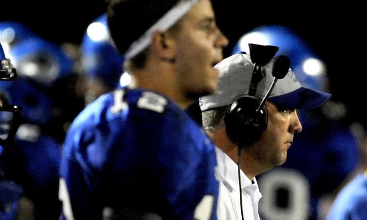 Coeur d’Alene high school head football coach Shawn Amos and his son, quarterback Gunnar Amos, watch the defense in the second quarter of the game against Skyline at Coeur d’Alene high school last Friday. (Kathy Plonka)