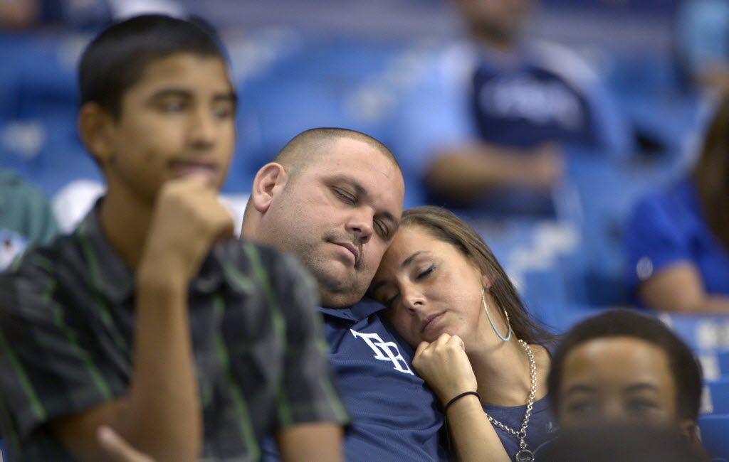 Two Tampa Bay Rays fans sleep in the stands during the 16th inning of a baseball game against the Baltimore Orioles in St. Petersburg, Fla., Saturday. You write the cutline. (AP Photo/Phelan M. Ebenhack)