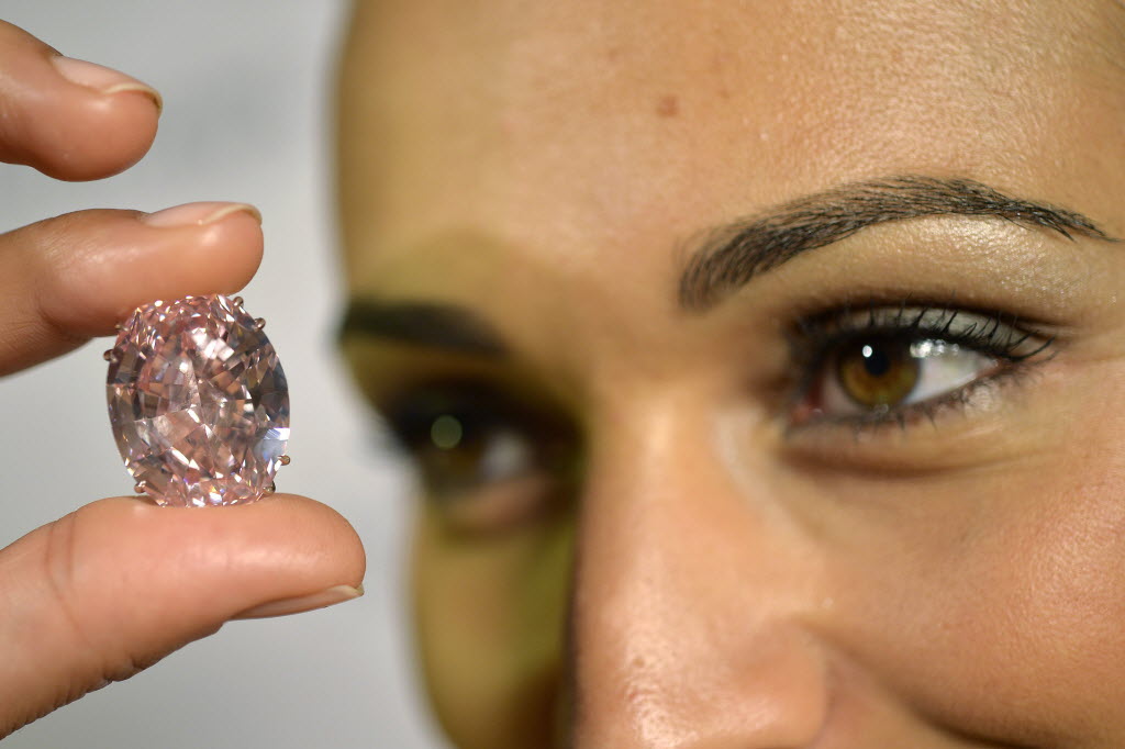 A Sotheby’s employee shows The Pink Star diamond weighing 59.6 carat, during a preview at Sotheby’s, in Geneva, Switzerland, earlier today. The Pink Star, one of the world’s natural treasures, is the most valuable diamond ever to be offered at auction, estimated in excess of US $ 60 million. You write the cutline. (AP Photo/Keystone,Martial Trezzini)