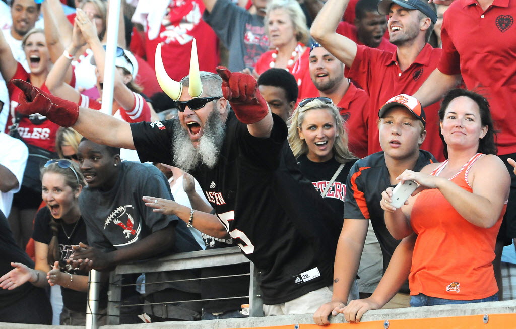 Mark Gehring, center, father of an Eastern Washington player, cheers as a pair of Beaver fans, Garrett Barnes, 13, and aunt Lori Barnes watch the Eagle’s celebration over Oklahoma State, Saturday, during an NCAA college football game at Reser Stadium in Corvallis, Ore. EWU upset Oregon State 49-46. You write the cutline. (AP Photo/Corvallis Gazette-Times, Jesse Skoubo)