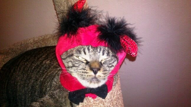 You can blame DFO for this one. He apparently thinks kitty cats are the spawn of Satan. So, when I was out shopping and found this, I had to buy it for Thor. Who knew the devil wears a bow tie?