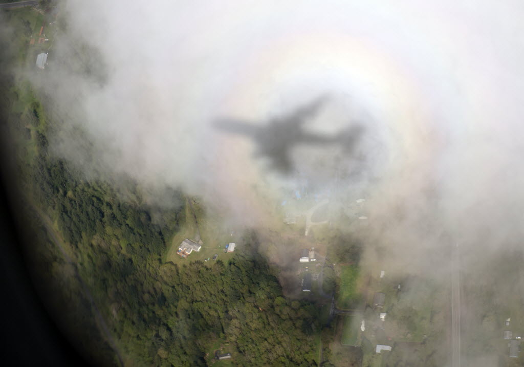 The shadow of Air Force One, with President Barack Obama aboard, is seen on a cloud as it approaches Paine Field Airport today in Everett, Wash., en route to Oso, Wash., the site of the deadly mudslide that struck the community in March. (AP Photo/Carolyn Kaster)
