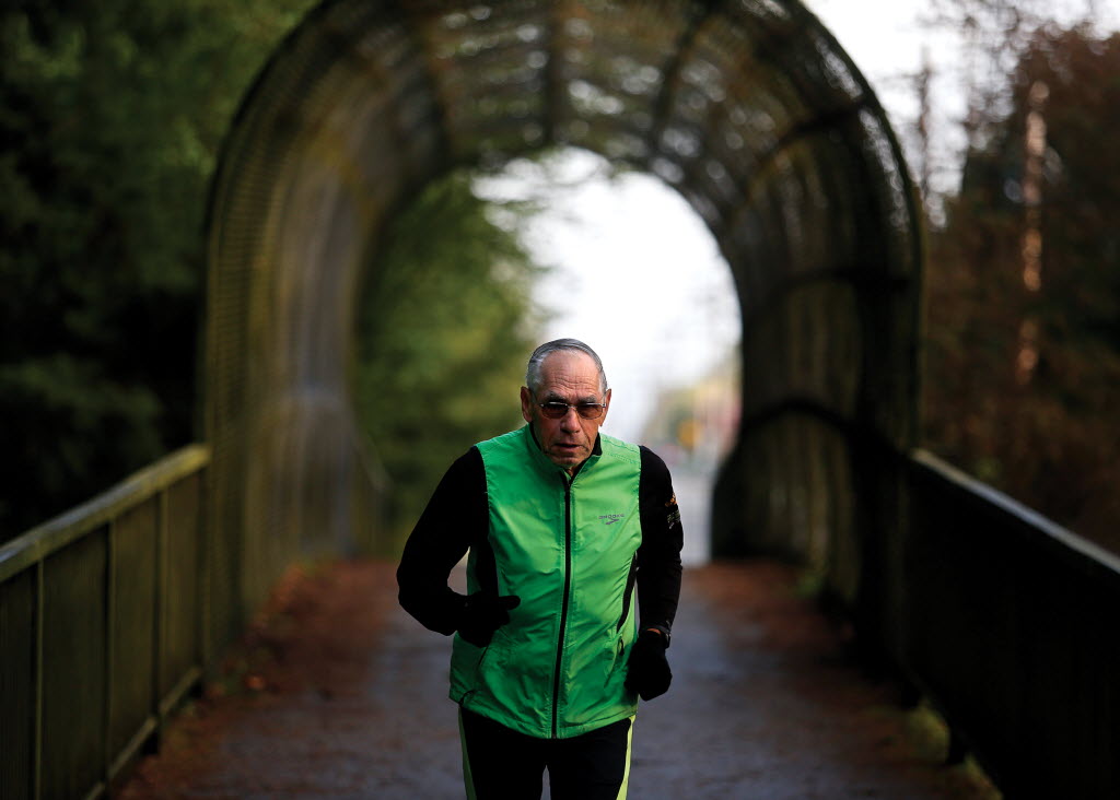 Bill Iffrig, 79, runs across an old footbridge, which enters Forest Park over Mukilteo Blvd, early Friday morning in Everett, Wash. Iffrig is conditioning for an upcoming marathon in Spokane. A photo of a stunned Iffrig after the 2013 Boston Marathon bombing is one of the best known from that tragedy. Story here. (AP Photo/The Herald, Dan Bates)