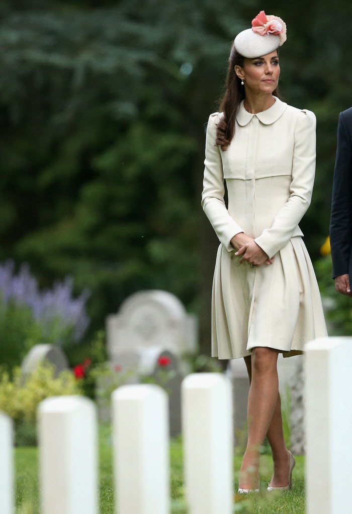 Kate, Duchess of Cambridge walks by World War I gravestones as she arrives for a commemoration ceremony to mark the 100th anniversary of the outbreak of World War I at the St. Symphorien Cemetery in St. Symphorien, Belgium today. The cemetery was established by the German Army as a final resting place for British and German soldiers killed at the Battle of Mons. Among those buried is Pvt. John Parr of the Middlesex Regiment, the first British soldier to be killed in action on the Western Front. (AP Photo/Chris Jackson, Pool)