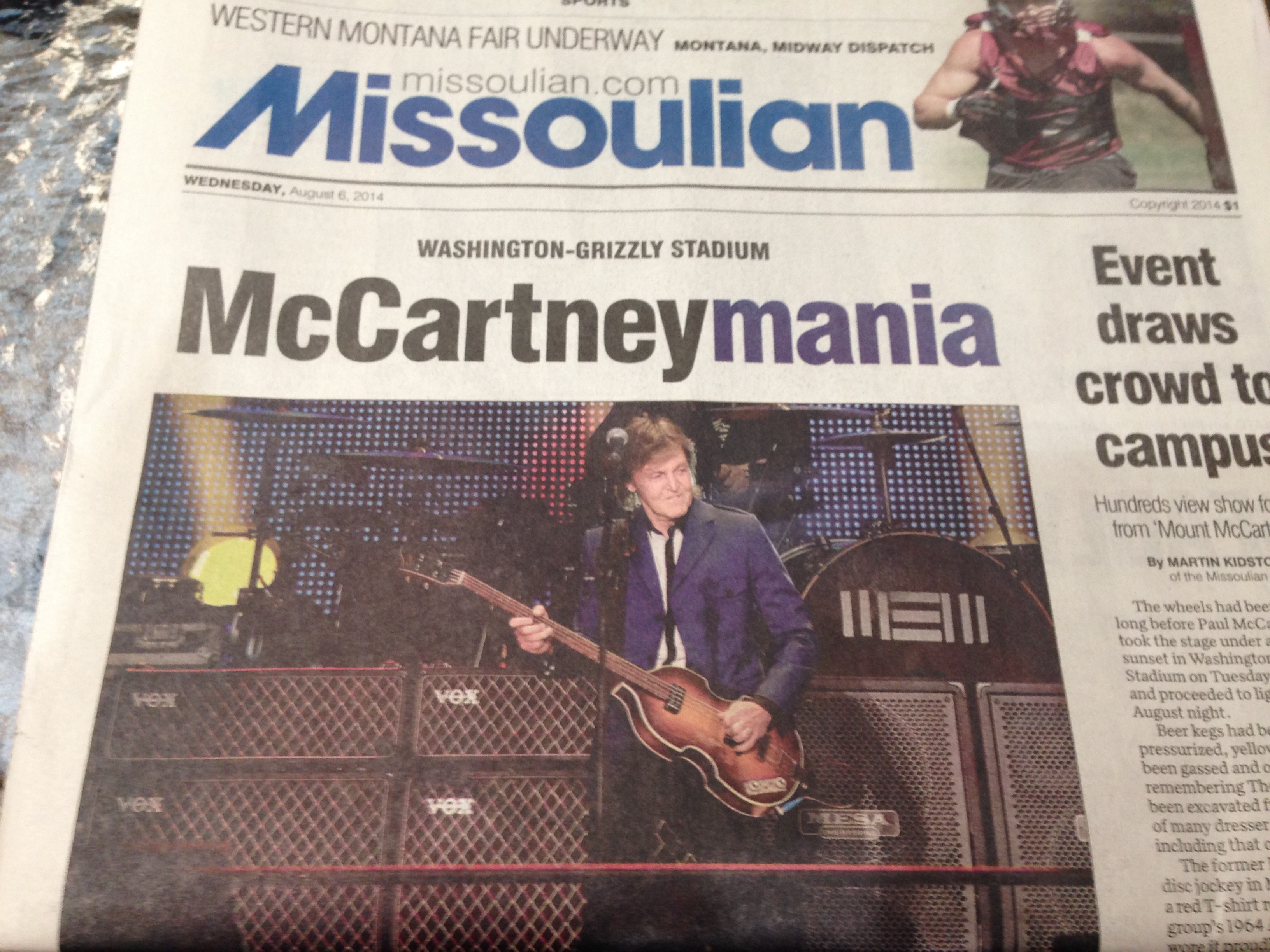 With a crowd of 25,000, the show on Tuesday has been called the largest ever held in the state of Montana. And it was clear the assembled masses loved every minute of the nearly three-hour show. The Missoulian newspaper devoted much of its front page to McCartney coverage (see above) and posted a photo gallery of images on its website. If McCartney ever comes this way again, I’d be hard pressed to let the chance to see him pass me by.