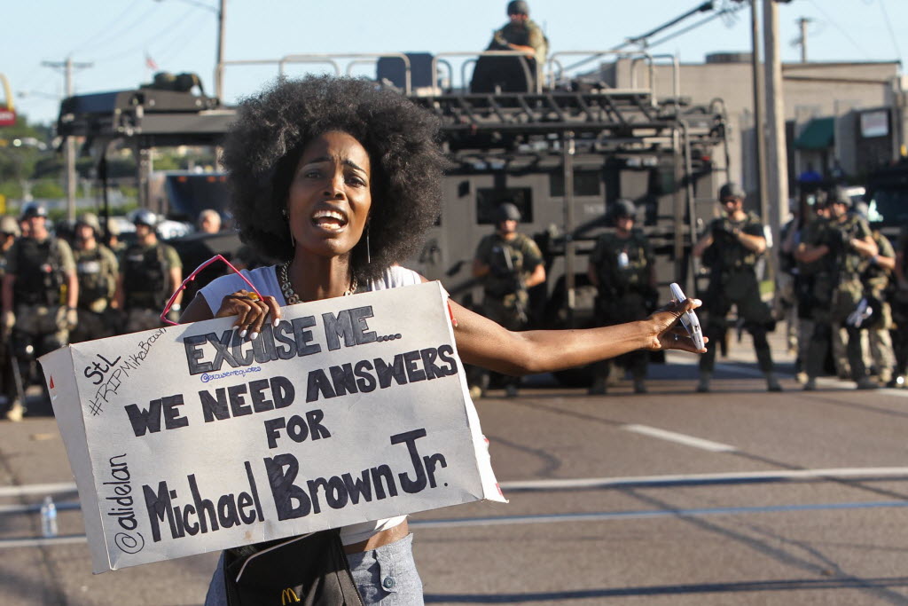 A protester shouts as she moves away from a line of riot police in Ferguson, Mo. on Wednesday. On Saturday, Aug. 9, a white police officer fatally shot Michael Brown, an unarmed black teenager, in the St. Louis suburb. (AP Photo/St. Louis Post-Dispatch, J.B. Forbes)