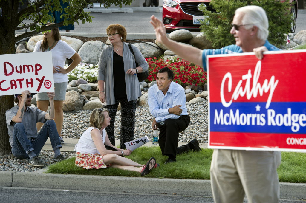 Jamie Stell, right, shows his support for Congresswoman Cathy McMorris Rodgers as her opponent Joe Pakootas, kneeling, chats with supporter Judy Avery, sitting, outside the Lincoln Center moments before McMorris Rodgers held a town hall meeting. Story here . (SR photo: Dan Pelle)