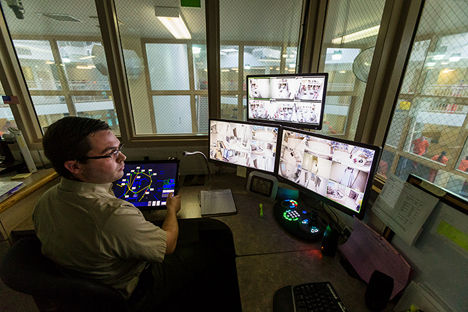 Kootenai County Sheriff’s deputy Josh Dunne works at a monitoring station Monday during his shift at the jail in Coeur d’Alene. Overcrowding has put a strain on the facility’s resources, prompting the sheriff to seek a solution that included a proposal for new jail. (Coeur d’Alene Press photo: Shawn Gust)