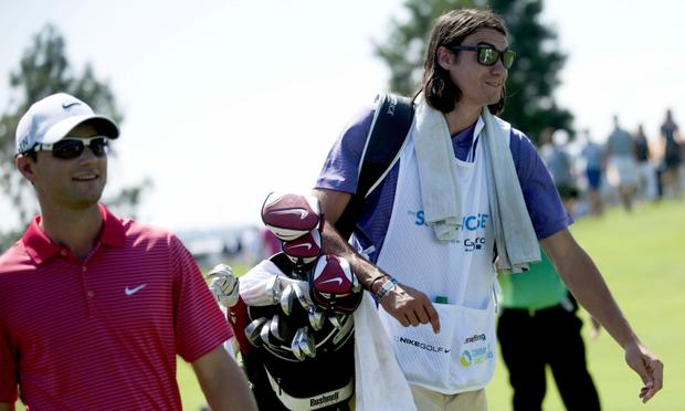 Former Zags basketball great Adam Morrison, right, caddies for Kyle Stanley at The Coeur d’Alene Resort Golf Course. Pros and celebrities teamed up to raise money to fight cancer. Story here . (Photo: Kathy Plonka)