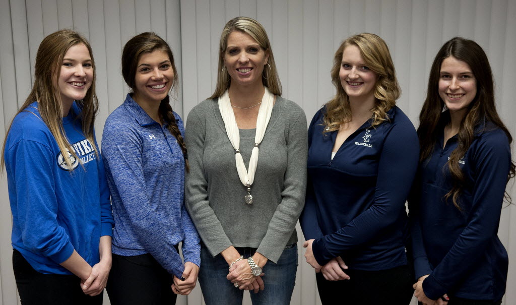 All-North Idaho Volleyball Team, left to right: Missy Huddleston (Coeur d’Alene), Megan Ramseyer (Coeur d’Alene), Coeur d’Alene coach Dee Pottenger, Brittany Gay (Lake City), Natalie Taylor (Lake City). Not pictured: Taylor Martin (Sandpoint), Emilee Schlader (Lewiston), Brett Hastings (Lewiston), Halle White (Lewiston). (SR photo: Kathy Plonka)