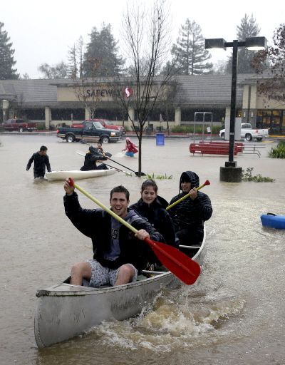 Three people use a canoe to make their way through a flooded parking lot at a shopping center Thursday in Healdsburg, Calif. A powerful storm churned through Northern California Thursday, knocking out power to tens of thousands and delaying commuters while soaking the region with much-needed rain. (AP Photo/Eric Risberg)