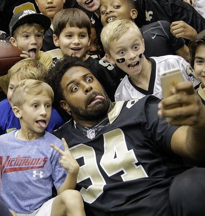 New Orleans Saints defensive end Cameron Jordan (94) takes a selfie with kids attending his football clinic at the Saints’ practice facility in Metairie, La. You write the cutline. (AP Photo/The Times-Picayune, David Grunfeld)