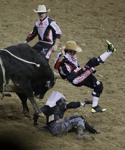 Dusty Tuckness gets tossed into the air by a bull while protecting bull rider Trey Benton III during the eighth go-round of the National Finals Rodeo Thursday in Las Vegas. (AP Photo/John Locher)