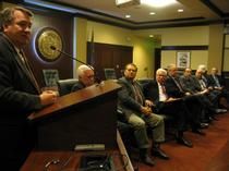 (SR photo: Don Soltman, left, president of the Idaho State Board of Education, joins all eight of Idaho’s public college and university presidents Monday to speak out “emphatically” against SB 1254)