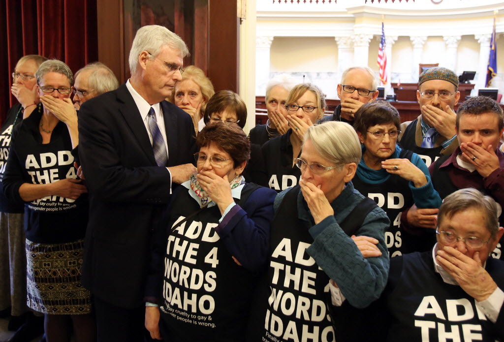 Senate President Pro Tem Brent Hill (R-Rexburg) is blocked from entering the Senate chambers by Demonstrators at the Idaho Statehouse in Boise today. The protestors are advocating adding gender identity and sexual orientation to the state’s human rights ordinance, but have thus far been unsuccessful in advancing the legislation. They cover their mouths to symbolize their feelings of disenfranchisement. See story below. (Idaho Statesman/ AP photo: Joe Jaszewski)