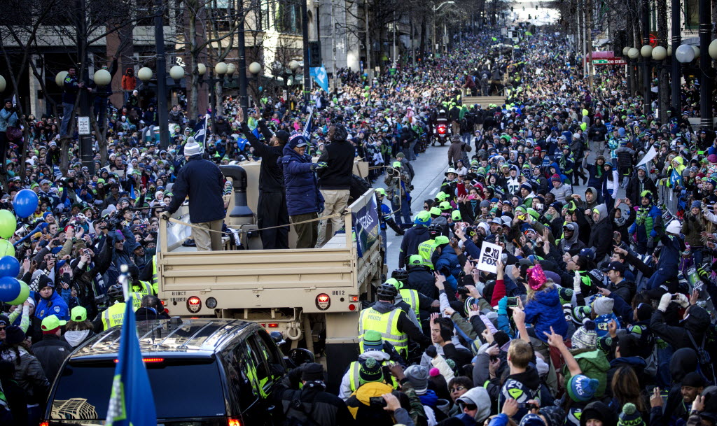 Russell Wilson (blue jacket) stands with other Seahawk quarterbacks and waves to the crowd in a parade for the NFL football Super Bowl champions earlier today in Seattle. The Seahawks defeated the Denver Broncos 43-8 on Sunday. (Seattle Times: Ellen M. Banner)