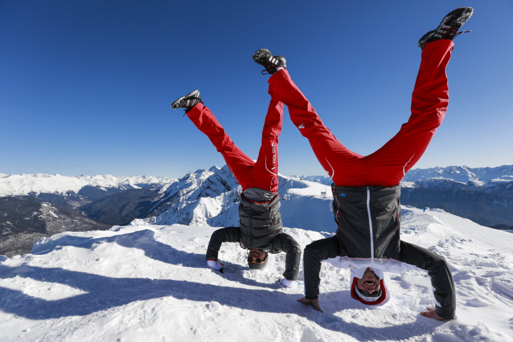 Bobsledder Pawel Mroz, right, and luger Karol Mikrut, both of Poland, do a handstand for a photograph on Rosa Peak, 2320 meters above sea level, at Rosa Khutor ski resort in Krasnaya Polyana, Russia ahead of the Sochi 2014 Winter Olympics on Thursday. (AP Photo/Gero Breloer)