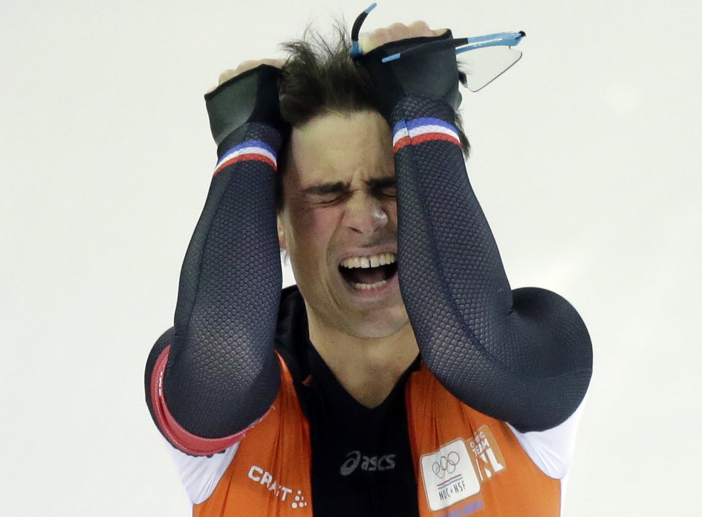 Silver medallist Jan Smeekens of the Netherlands pulls his hair after completing his second heat for the men’s 500-meter speedskating race at the Adler Arena Skating Center at the 2014 Winter Olympics earlier today in Sochi, Russia. (AP Photo/David J. Phillip)