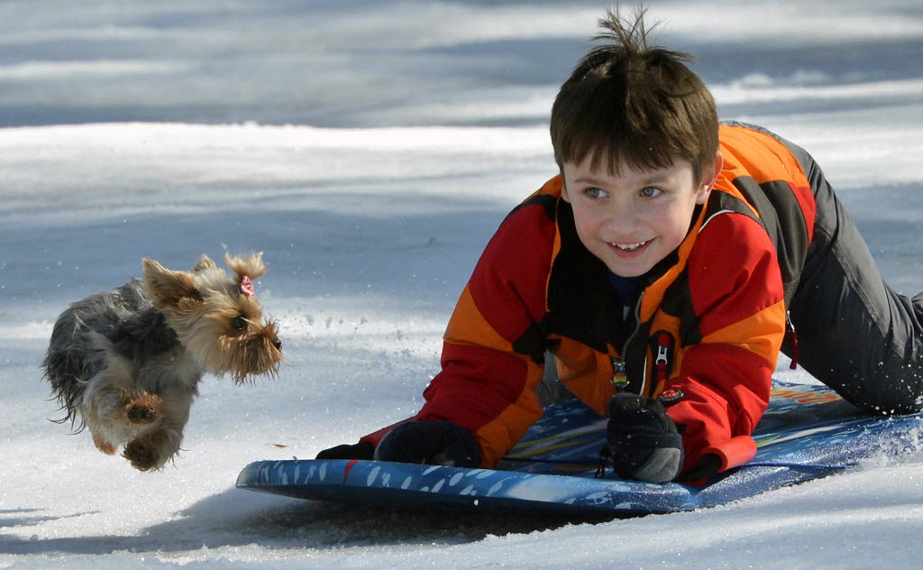 Bella, a Yorkshire terrier, chases Dakota Gruver, 7, down a slope at the Hillandale Golf Course in Durham, N.C., today. (AP Photo/The News & Observer, Chuck Liddy)