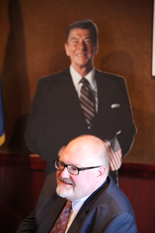 A cutout of Ronald Reagan looks over Jeff Ward’s shoulder at the Kootenai County Reagan Republican luncheon at Fedora’s Thursday. (Photo: Duane Rasmussen)