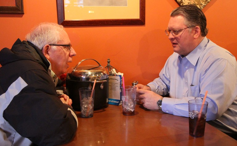 Tony Stewart, former North Idaho College instructor and long-time human-rights leader, and attorney Duane Rasmussen exchange ideas during Blogfest 2014 at the Steve Widmyer’s Fort Ground Grill. Duane is reponsible for many of the fine photos of local political events that you see on Huckleberries Online. However, this photo was taken by Don Sausser.