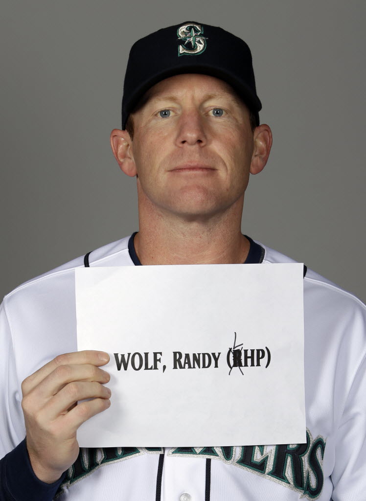 Seattle Mariners pitcher Randy Wolf holds up his identification sheet with that corrects him from a right-handed to left-handed pitcher, as he poses on photo day at baseball spring training today in Peoria, Ariz. (AP Photo/Tony Gutierrez)